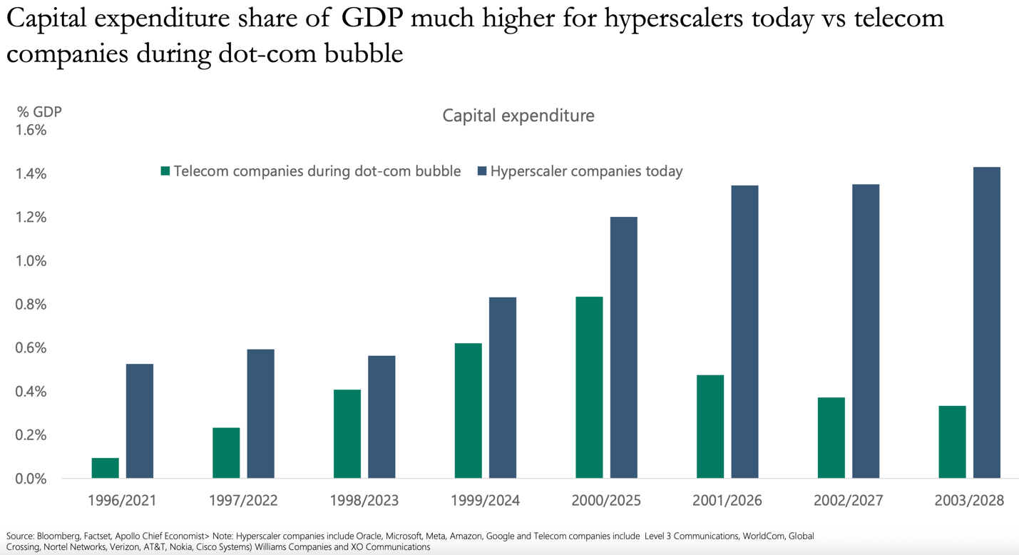 Capex is what companies spend on long-term growth - like data centers, servers, and energy infrastructure for hyperscalers. Apollo’s chart shows today’s AI capex as a share of GDP versus the network buildout by telecom companies in the late ’90s. The takeaway: today’s AI investment wave is far bigger and far more necessary than the dot-com buildout. Comparing the two eras doesn’t hold up.