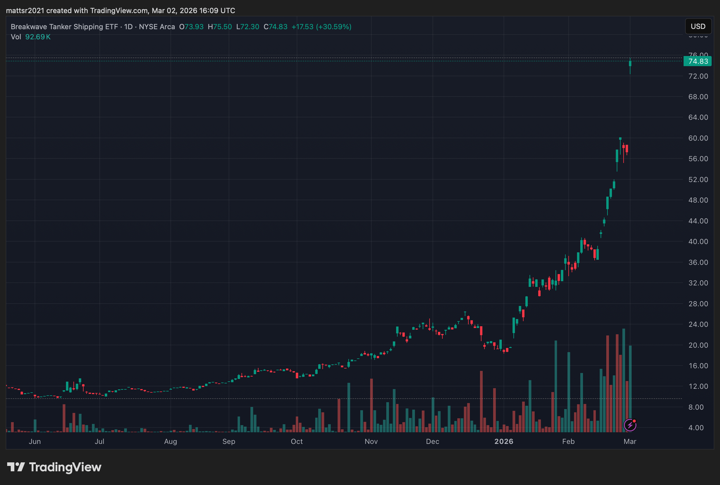 One more standout: Breakwave Tanker Shipping ETF (BWET) is up 31% today. I talked about this ETF on the February 11 podcast - and it’s nearly doubled since then.