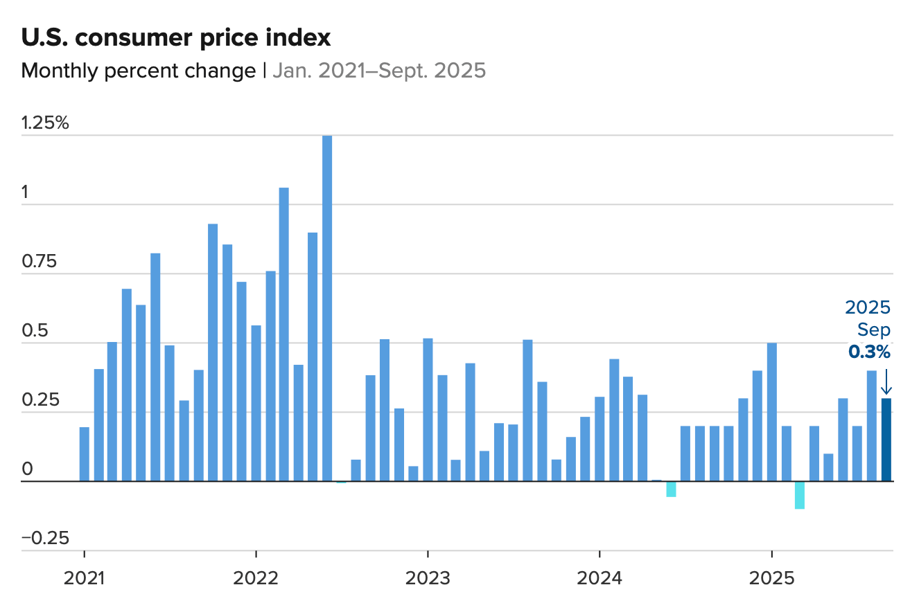 This morning’s Consumer Price Index (CPI) report showed prices rose just 0.3% in September, softer than the 0.4% economists expected. On an annual basis, inflation sits at 3.0%, slightly below forecasts and well within the “comfort zone” the Federal Reserve wants to see as it gears up for another rate cut next week.