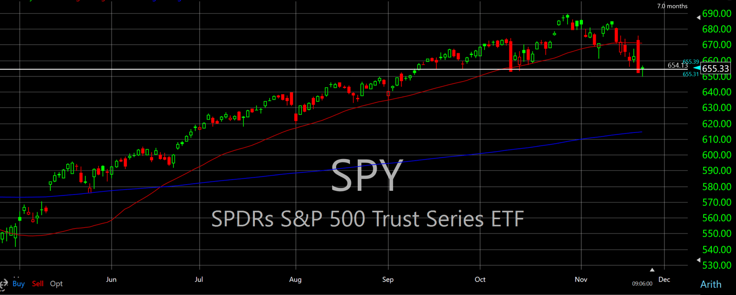 For nearly two months I have been highlighting a specific level on the SPDRs S&P 500 ETF (SPY) for my paid subscribers. The level - $654 - was viewed as important short-term support for the most widely followed stock index. Yesterday, the SPY closed below the support line by a couple of points, triggering a possible red flag.